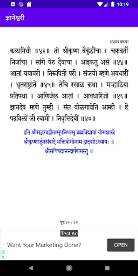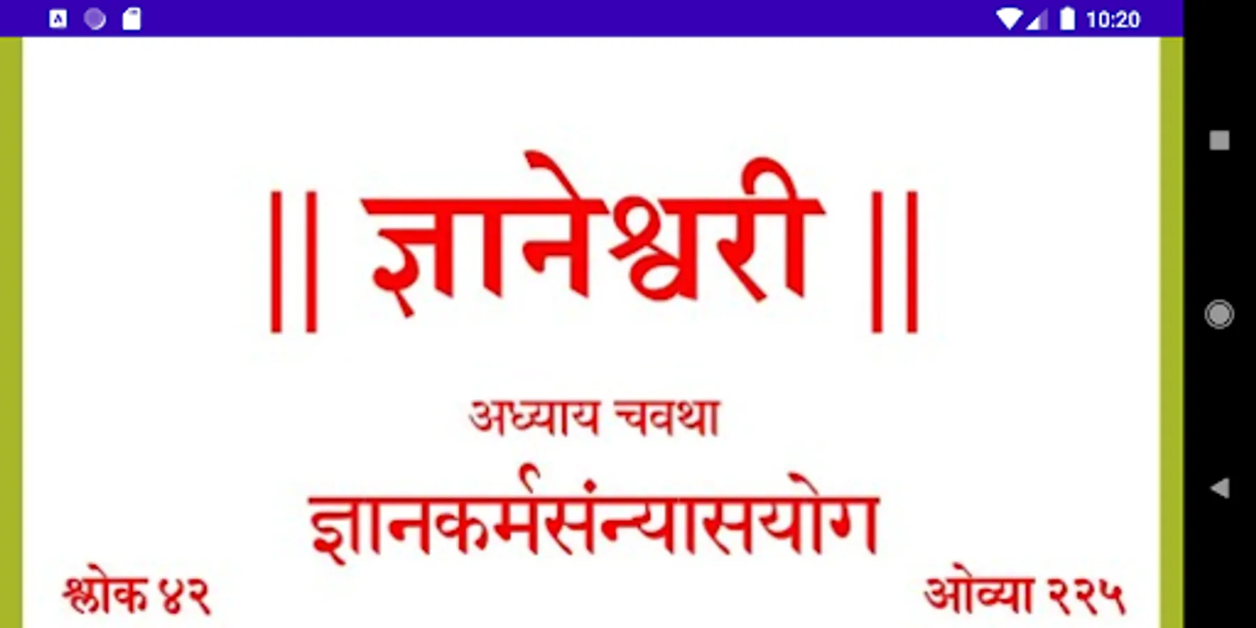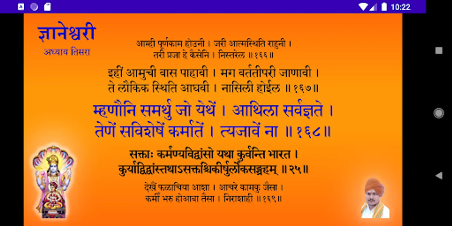 Dyaneshwari is a commentary written by Saint Dynaeshwar Maharaj on Shrimad Bhagwat Gita. This is written in Prakrut Marathi and is followed by Warkaris all over the world. This is the most authentic and widely read commentary on Bhagwat Gita written in Marathi, which can be compared to similar commentary written by Shri Shanaracharya in Sanskrit.