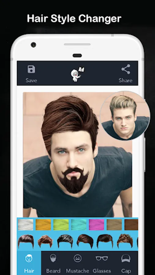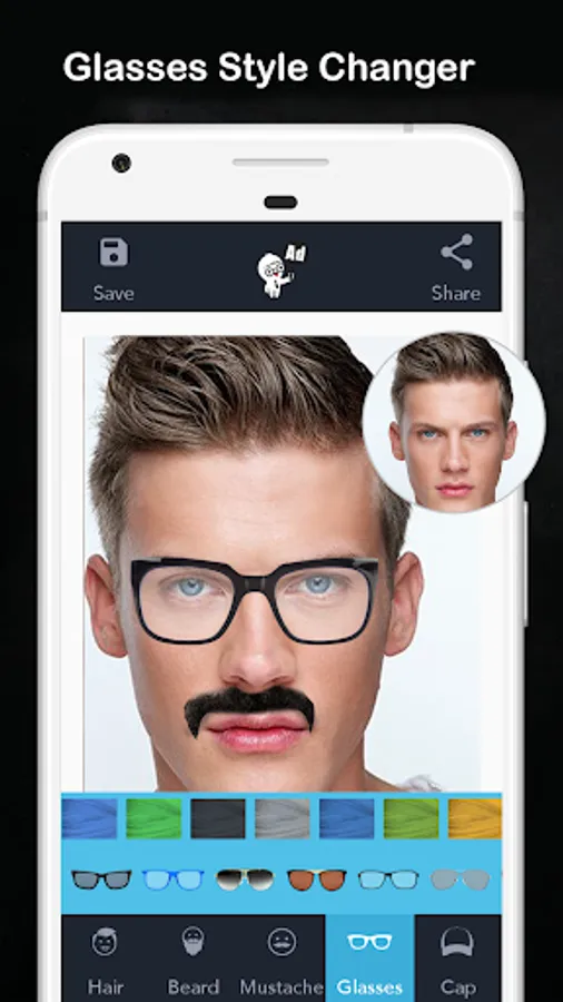 Use this hairstyle changer app or hair style photo editor, to explore various cooling glasses, hairstyles, mustache styles and beard styles. The various hairstyles, this hairstyle changer app or beard photo editor, offers, makes it unique.