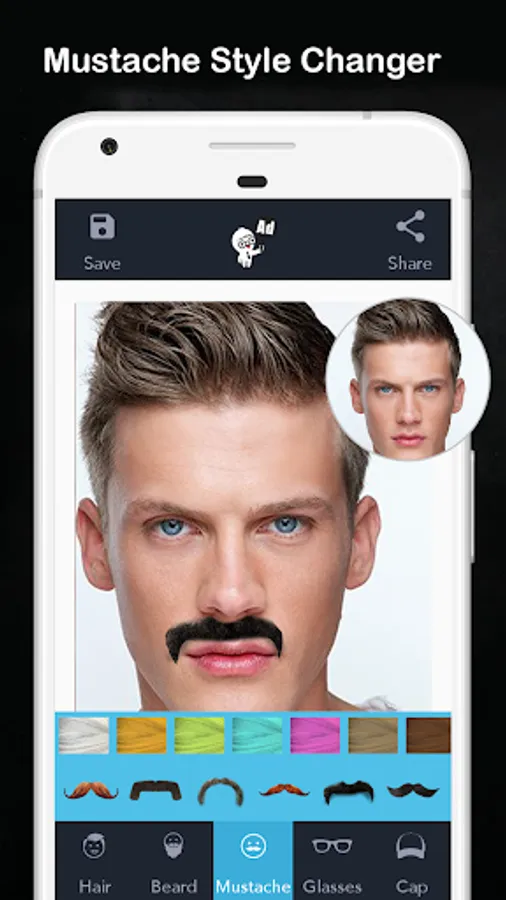 Try out different patterns and colors of hairstyles for men, using this man mustache and man hair style photo editor, or man hair style app and best man hair style app.