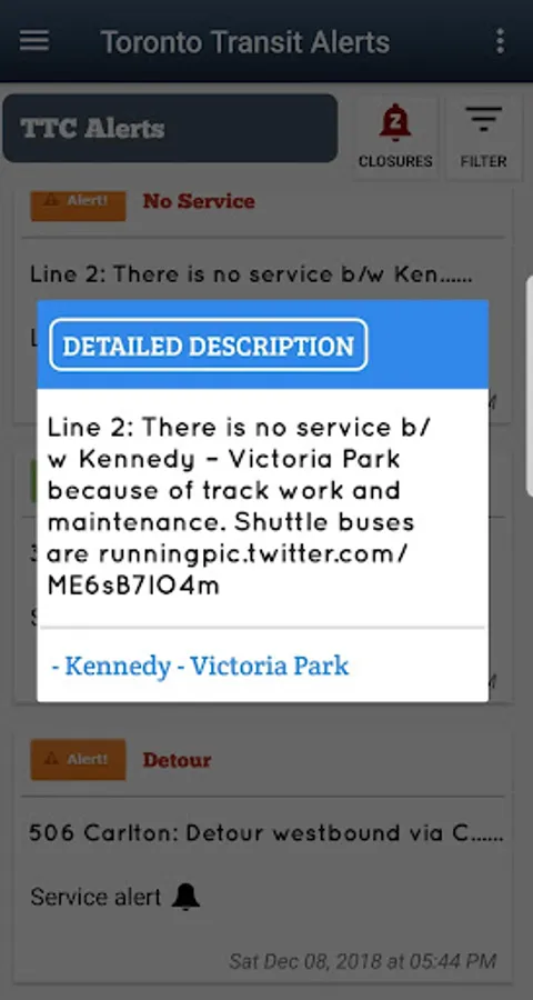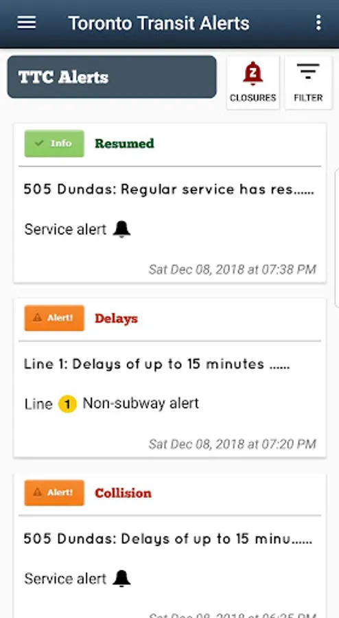 A simple app to let you know about the real time alerts for some of the major transit options like TTC, GO etc. in a consolidated way. Filter unnecessary alerts,watch for only required such us delays, closures etc. Track alerts that are only in your subway lines. All this in one teeny-tiny app.