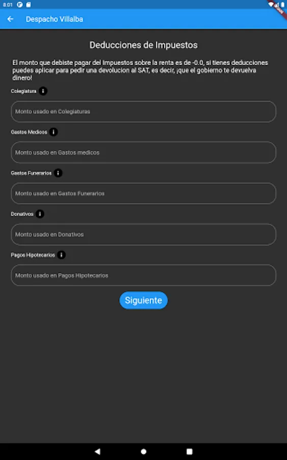 With this application you can calculate the taxes corresponding to your annual return, for the years 2016, 2017, 2018 and 2019, in addition to having a form that allows you to submit tax deductions to find out if you are eligible for a tax refund by the SAT .
