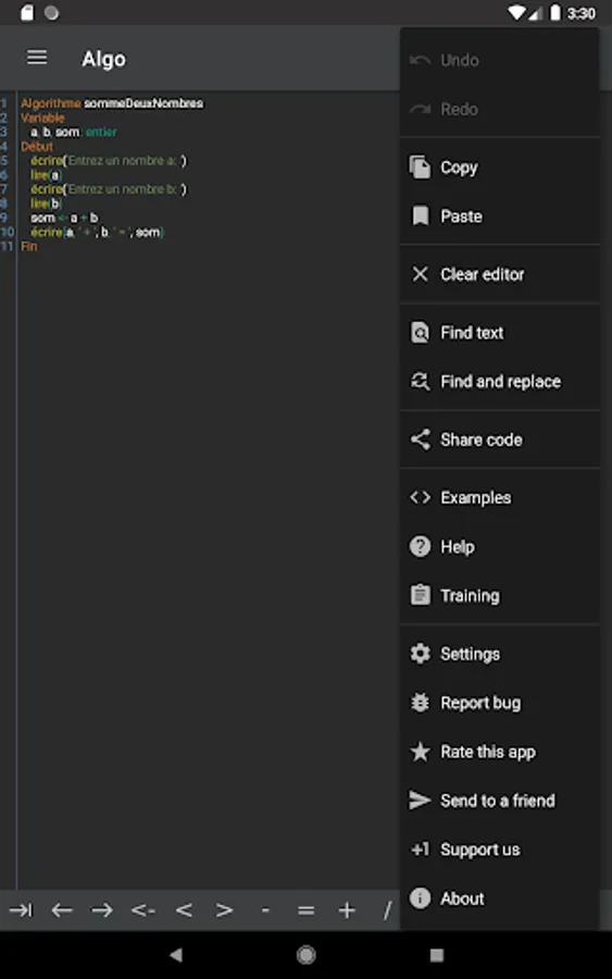 Algo is a powerful application for compiling and running algorithms (pseudo-code) written in French language. Designed to help biginners to verify their ideas as quickly as possible. This application aims to facilitate the process of understanding algorithms for beginners. can be also used in the classroom for educational purposes.