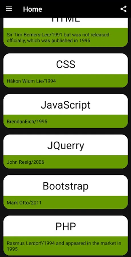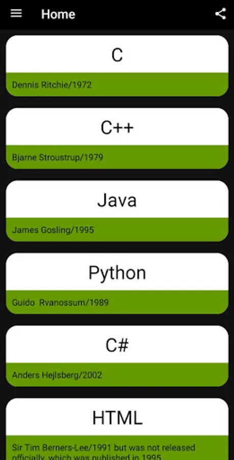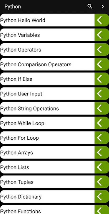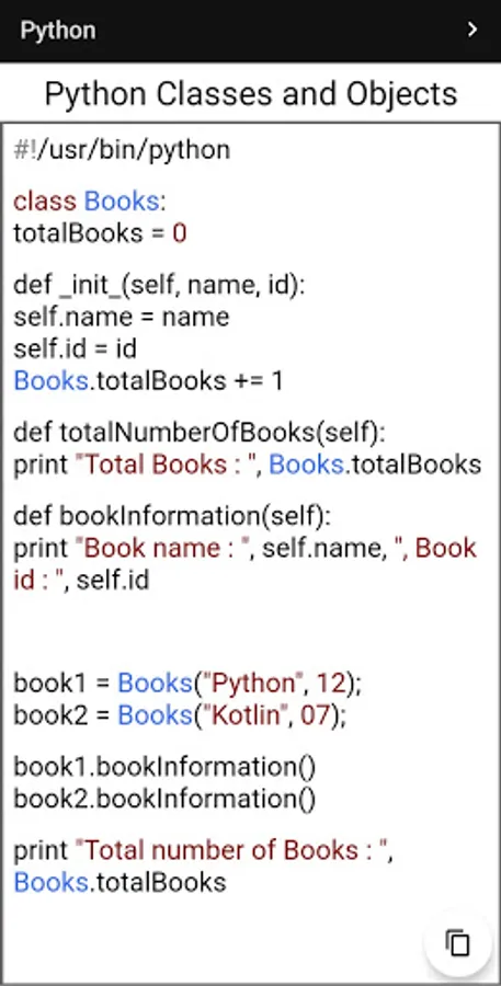 The appropriate application for beginners and intermediate levels in learning programming languages. Because it contains all the basics in a set of programming languages and examples, as well as outputs or results, meaning each example with its result, and it also contains the feature to copy the code if you want to paste it directly into an editor, whether you are learning programming on a phone or computer. I hope you like it.