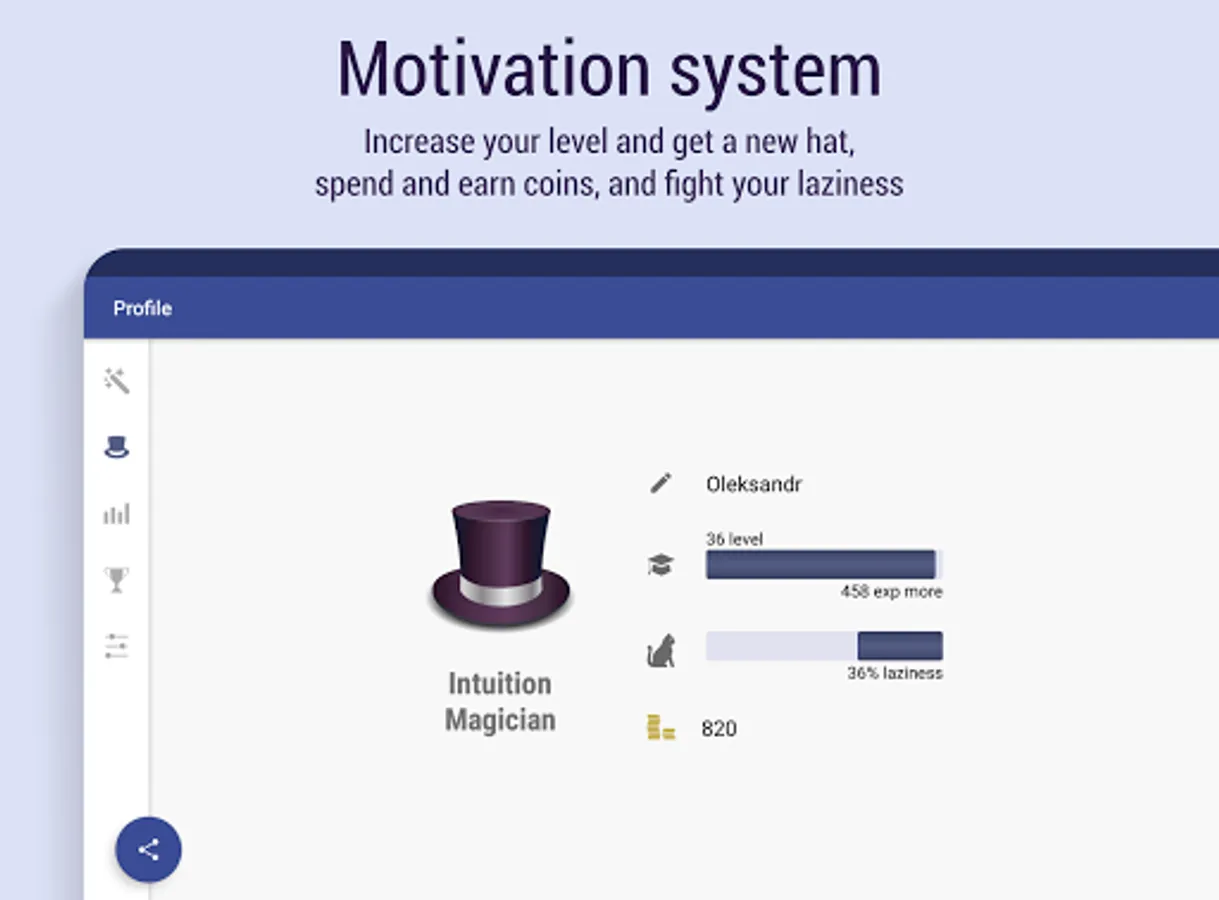 * Diverse motivation system, including coins, laziness progress bar etc.