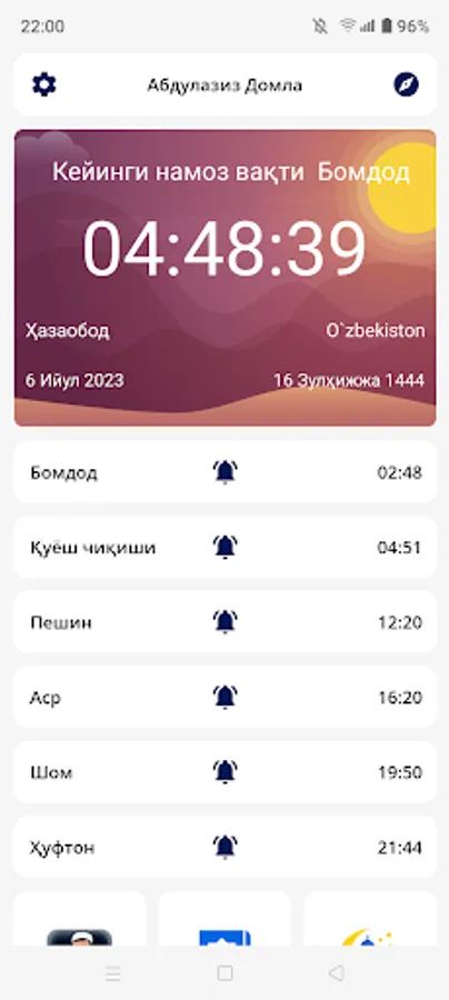 - Ilovaga kirib viloyatingiz va tumaningizni (shahar) tanlang va tumaningizga tegishli namoz vaqtlarini bilib oling.