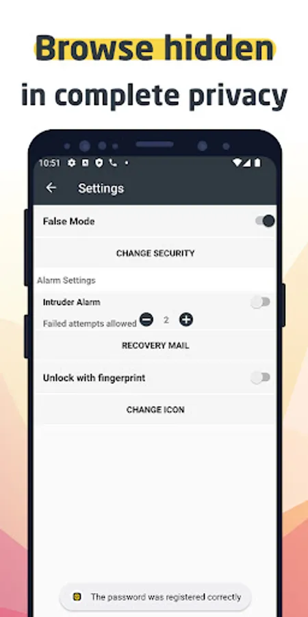 * Extra protection Fake mode where the appearance of the application is a calculator