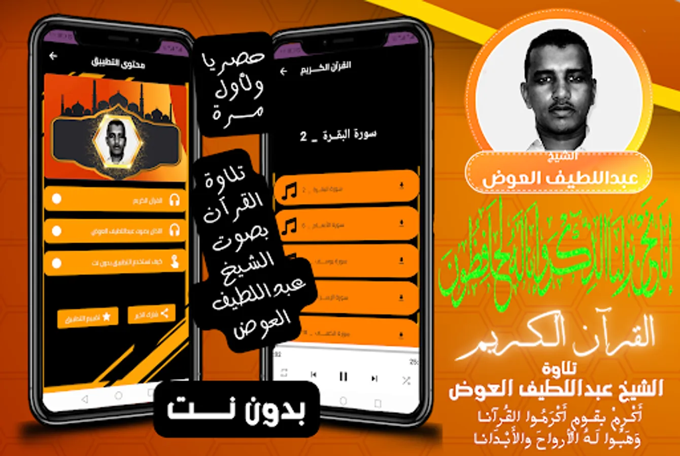The application of Sheikh Abdul Latif Al-Awad without the net will help you with that, just as the application will help you download the Qur’an with the voice of Abdul Latif Al-Awad to your phone easily