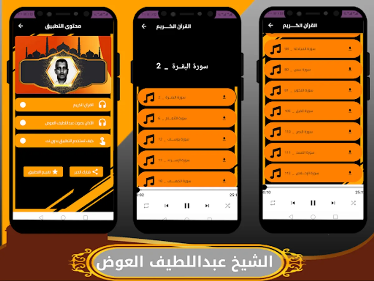 The Sheikh Abdul Latif Al-Awad application allows you to hear and download the Noble Qur’an with the voice of Sheikh Abdul Latif Al-Awad, and you can download the Noble Qur’an to your mobile phone easily and conveniently through one application that includes surahs and recitations from the Noble Qur’an mp3 with the voice of the reciter Sheikh Abdul Latif Al-Awad