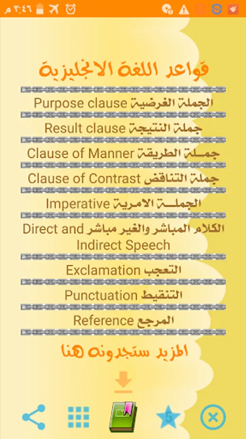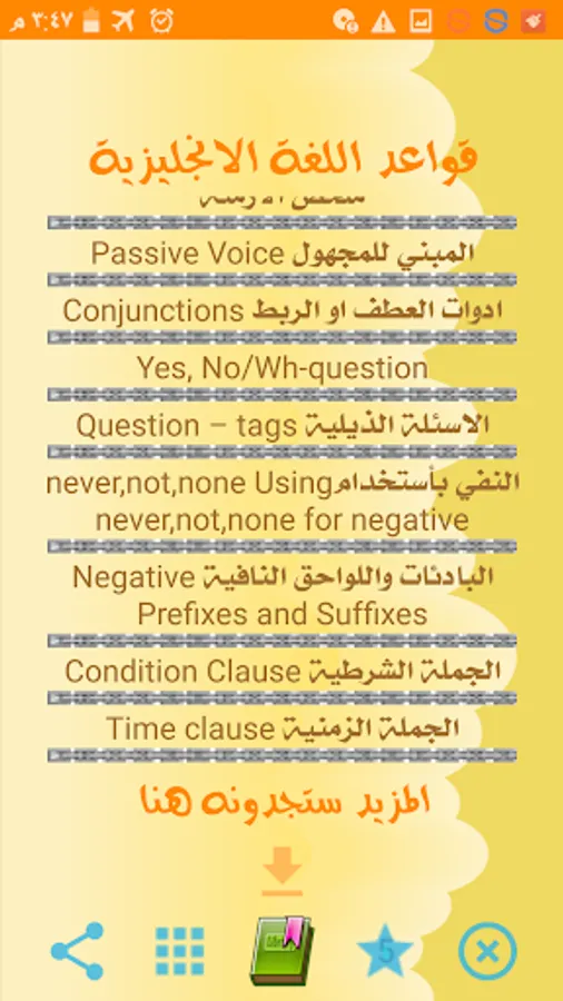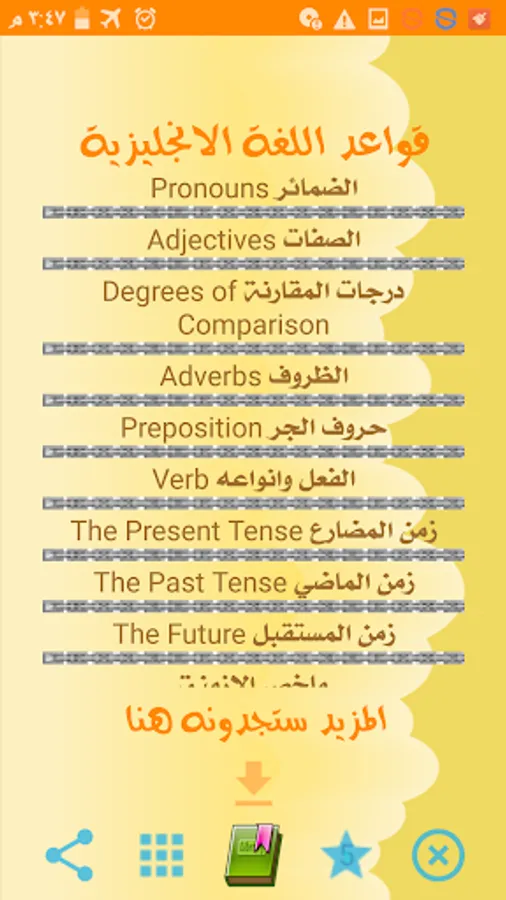 The content of the English grammar application is complete in detail without the net and one of the best content in English grammar, which has proven its effectiveness in acquiring the basics of English grammar, and you will find in it simplified English grammar, especially English grammar for students, and it has the ability to download English grammar pdf and you can learn English grammar _ English Grammar _. Indeed, the application is useful in English grammar for beginners, and at the same time it is distinguished for understanding and realizing English grammar for the third secondary grade.