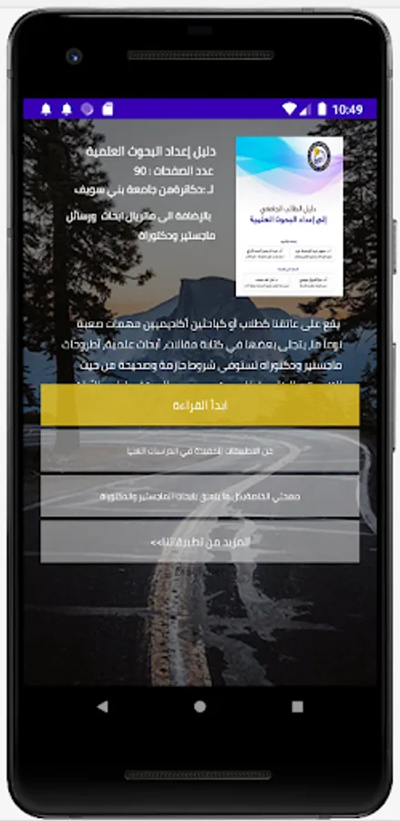 In view of the importance of reading, reading, and research, and to encourage scientific research, we created this application, through which we can share knowledge, especially with regard to postgraduate studies, such as scientific research, master’s theses, doctoral theses, and related materials. The application serves as a program for downloading scientific research for its participants and to benefit from it, and it is also possible to download doctoral theses through it. The application also includes a book on scientific research methods, through which we learn about the steps of scientific research, the definition of scientific research, its types, an introduction to scientific research, the importance and goals of scientific research, and many other useful topics in writing research and academic theses.