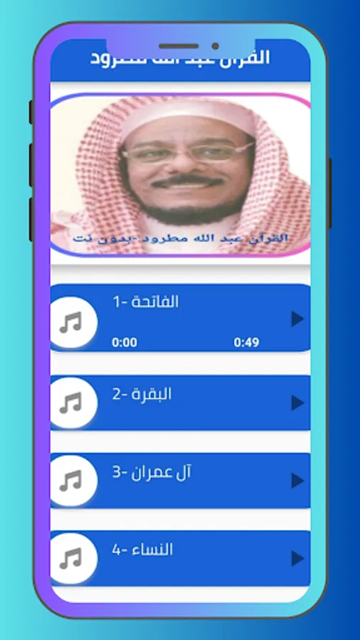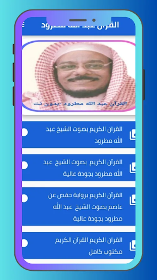 The application of the Noble Qur’an provides the voice of Sheikh Abdullah Matroud. You can hear all the surahs of the Noble Qur’an through your mobile phone or tablet with ease and ease through one program that contains all the surahs of the Noble Qur’an. In order to enjoy reciting the Noble Qur’an with the voice of Sheikh Abdullah Matroud wherever you want.