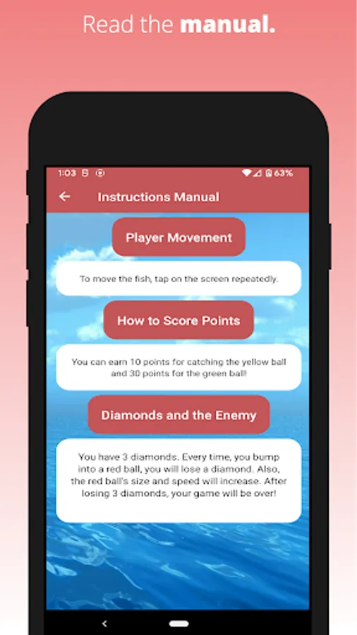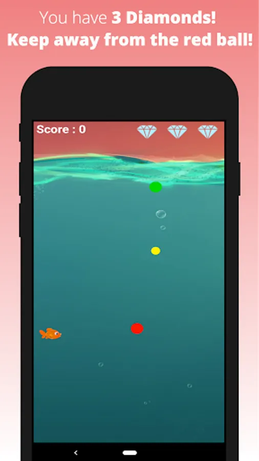 You have 3 diamonds. Every time, you bump into a red ball, you will lose a diamond. Also, the red ball's size and speed will increase. After losing 3 diamonds, your game will be over!