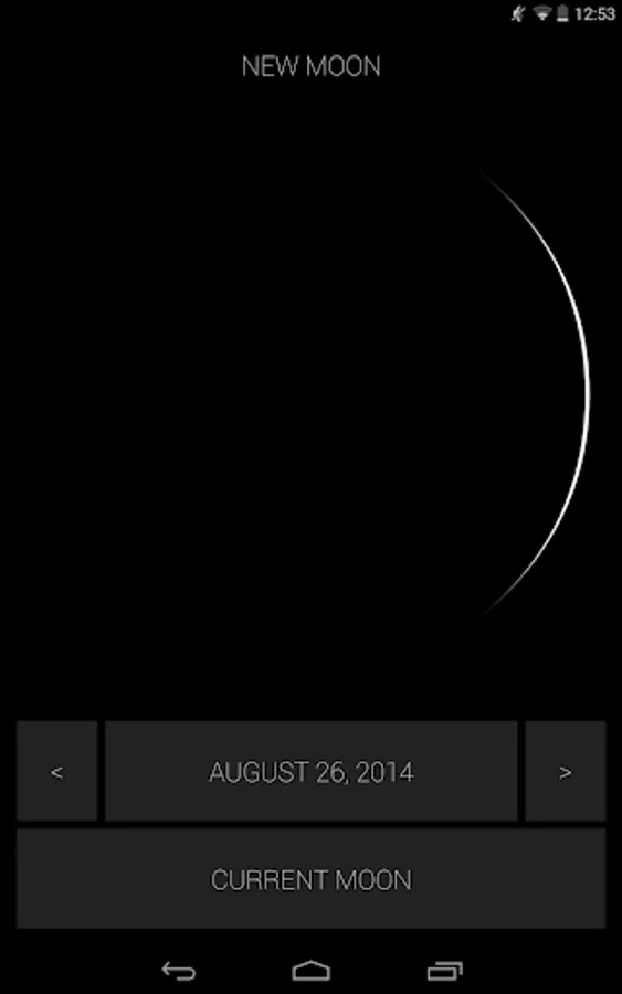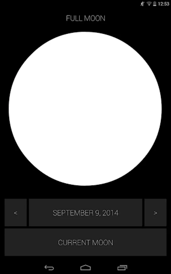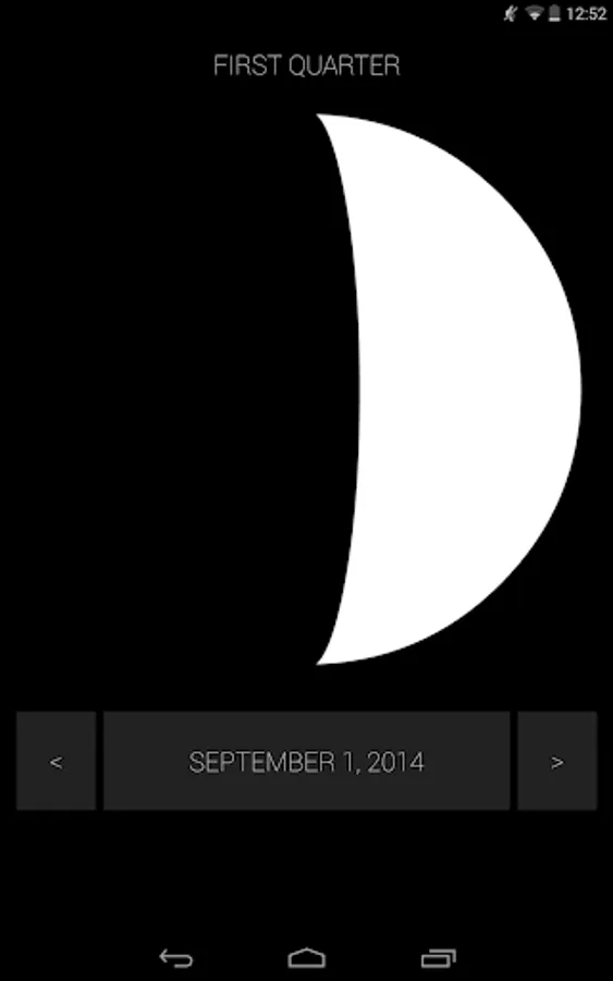 See the phases of the moon in the past, present or future. Tap the date to easily select a new date, tap/hold the arrows to see the phases animate, or tap Today to return to the present.