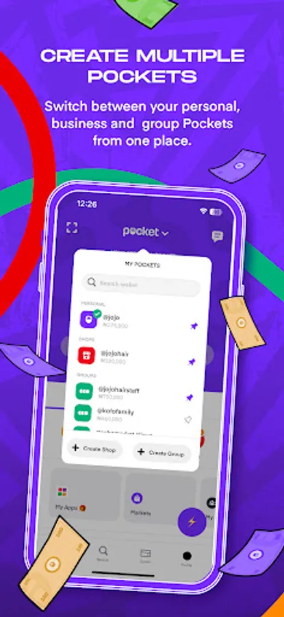 Pocket App has 3 types of accounts (pockets) you can use to send, receive and manage money: a personal pocket that lets you shop and pay bills easily, a business pocket that lets you create a web shop, track and manage your business payments and a group pocket that lets you manage cash with friends, staff, family or colleagues as a group. You can easily switch between pockets and move money across pockets.