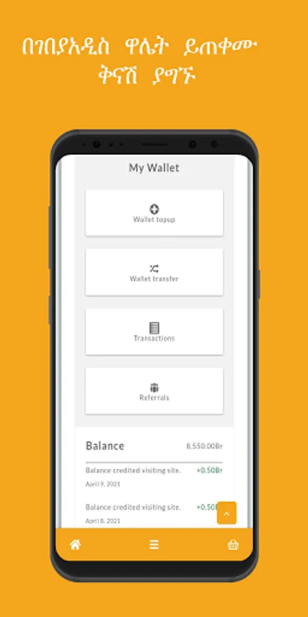 አካውንት ሲከፍቱ የገበያአዲስ ዋሌት ይኖሮታል፡ ዕቃዎችን በሚገዙበት ጊዜ ዋሌትዎ ላይ Bonus ያገኛሉ እንዲሁም መጀመሪያ አካውንት ሲከፍቱ፣በየቀኑ መተግበሪያችንን ሲጎበኙ እንዲሁም ዋሌት ውስጥ ገብተው Referrals ውስጥ ገብተው የእርሶን ሊንክ ኮፒ በማድረግ ለወዳጆት ሲያጋሩ እና ወዳጆችዎ አካውንት ሲከፍቱ እርሶ Bonus ያገኛሉ። እንዲሁም ከዋሌትዎ ለሌላ ሰው ማስተላለፍ እና ወደ ዋሌትዎ ገንዘብ በማስገባት በማንኛውም ጊዜ እና ሁኔታ ከዋሌትዎ በመክፈል ማዘዝ ይችላሉ።