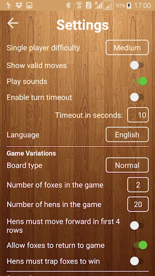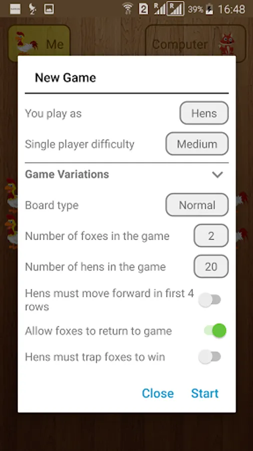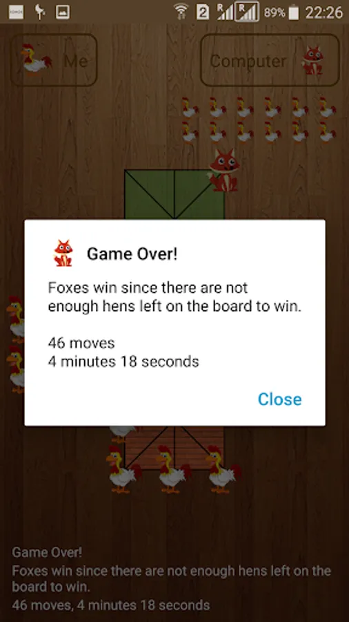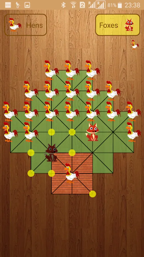 Fox and Hens (sometime called Foxes and Geese) is a strategy game where you can either play as foxes or hens. It’s a modification of the Scandinavian game Halatafl (or Tafl) and was brought to Europe by the vikings. There have been quite a few variations of the game rules since then which I’ve tried to incorporate in this game.