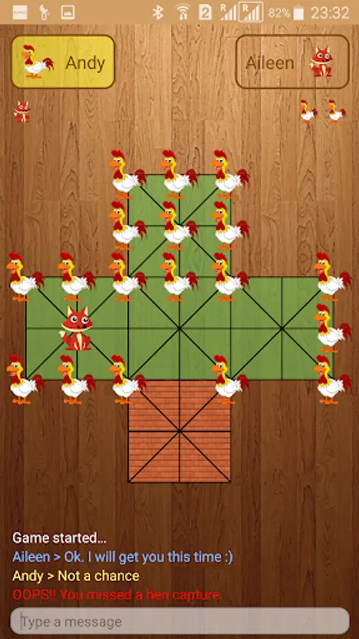 The objective of the hens is to avoid being eaten :) by the foxes and either trap the foxes or get 9 hens safely home in the hen house. The objective of the foxes, on the other hand, is to stop the hens reaching the hen house by eating enough of them so that they are not able to achieve their goal. Foxes can move in any direction one space at a time (similar to a king in checkers) but the hens can only move forwards or sideways. The fox can jump over and capture a hen so long as there is a vacant space beyond, but hens cannot jump over foxes. Foxes must eat hens if possible otherwise it is a foul and that fox is removed from the game until the remaining fox captures another hen, then the fouled fox re-joins the game. If the final fox also fouls, then the hens win the game.