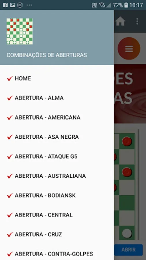 Damas Golpes de Openings is your definitive companion for mastering the game of checkers following the Brazilian rules. This app offers an extensive set of openings with diverse strategies on the first moves, allowing you to broaden your knowledge and improve your skills.