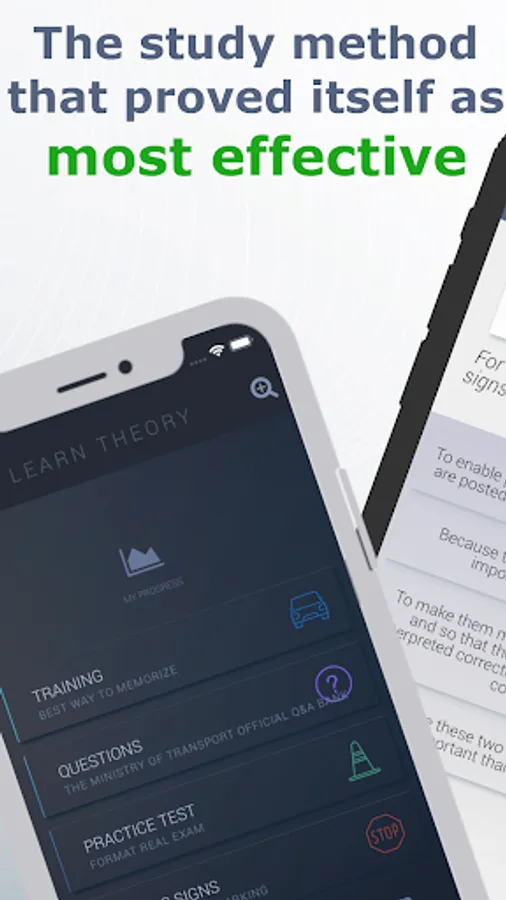 In addition to the training exercises – the application shows the graph of your training progress and grants you access to all of the questions that appear on the Ministry of Transport and Road Safety's official Q&A bank (relevant for 2023), divided into categories, road signs, simulations of the actual test format and the option to work on your errors.