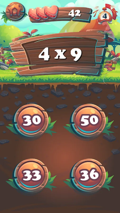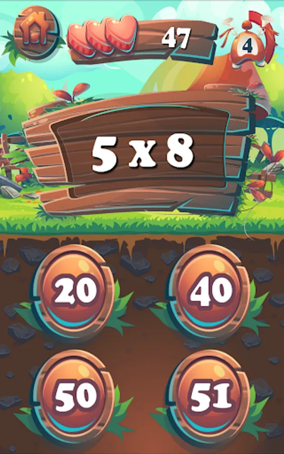 Multiplication Table Kids 10x10 works like a quiz. The first step is to select the table, a question will appear on the screen along with four options. On tapping the correct option, few points will be added to the player’s score tally. On the other hand, tapping the wrong answer will cost the player a life. The players will have to tap an option in limited time period. Failing to do so will also cost them a life. However, the option of “more time” can come to their rescue. Availing this option will give them more time to complete the quiz.