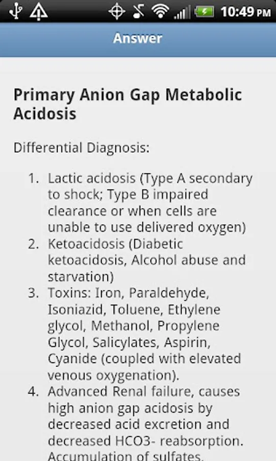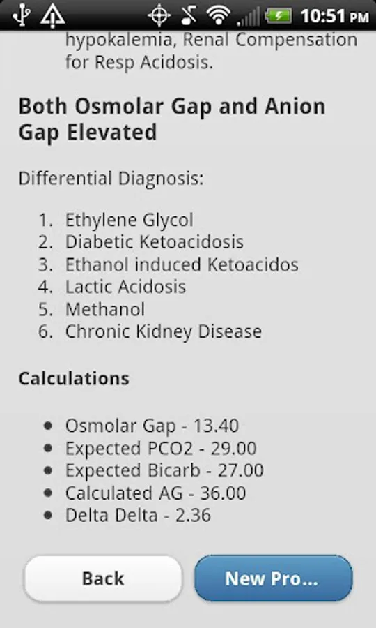 * Provides differential diagnosis of each disorder in your Arterial Blood Gas and Osmolar Gap.