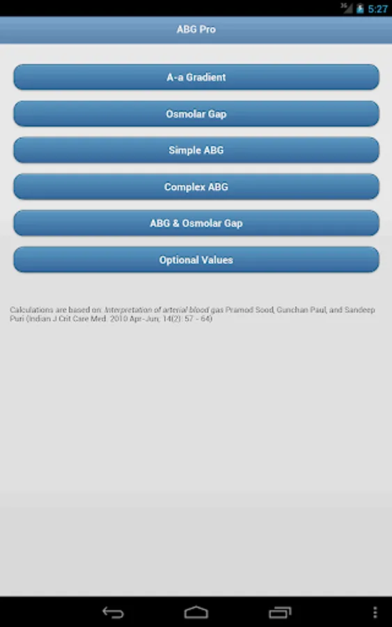 This app has been developed by a ABIM Certified Internal Medicine Physician in the US and calculations are based on: Interpretation of arterial blood gas. Pramod Sood, Gunchan Paul, and Sandeep Puri (Indian J Crit Care Med. 2010 Apr-Jun; 14(2): 57 - 64)