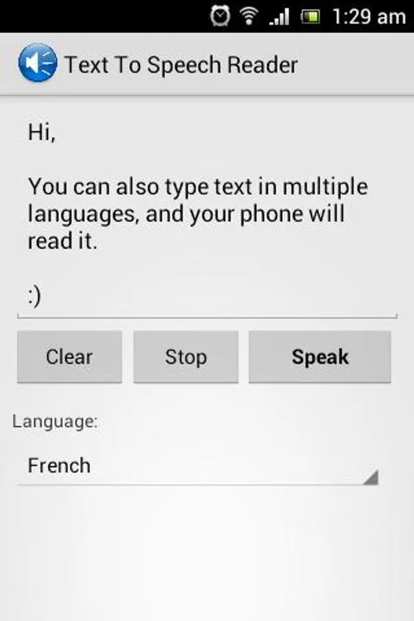 Text To Speech Reader is a Text to Voice Converter app that will read aloud any text you type. Simply type any text and press the speak button to hear your text. A very useful tool for someone with speaking difficulty or anyone learning new languages. Supports voice output in multiple languages.