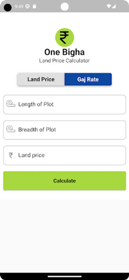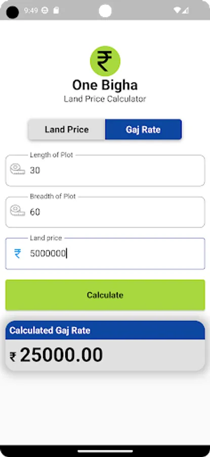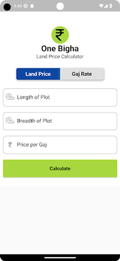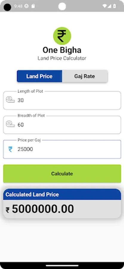 Calculate the price of the land area/plot with the app One Bigha. It provides users with an interactive UI, effective UX, and easy app access. Also, calculate the price per bigha from the dimensions of the land area and the total price.