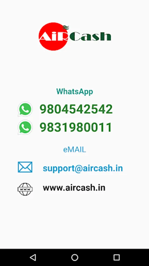 For any further query or doubt, please WhatsApp 9804542542 / 9831980011 (Whatsapp only) or email at support@aircash.in