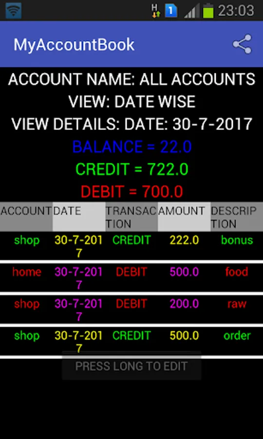 4.EDIT DATA - To edit the data you just need to long press the entry that you want to edit on view page and you will be redirected to edit page of My Account book.