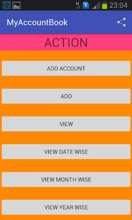 1. ADD ACCOUNT - This is the first thing that you need to do before adding any transaction to My Account Book. Account is a broad head under which u may enter your expenses or income. For example you may have two accounts named OFFICE and HOME and in OFFICE account you can add all transaction that were done at office while in HOME account you can add all your expenses like food etc. There is no limit to the number of accounts that you can add to My Account Book.