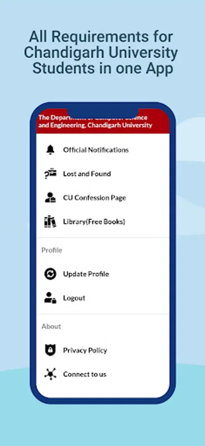 App made only for CU Student ,through this they can access free study material, get free internships, find roommates and travel buddies ,can also post if they have found anything or lost anything and reach the owner easily, confess the things privately and publicly and also get daily updates of college notifications, this app is specially made by our team for the CU students so that they can get all the things at one place and utilize them for their well fare , there are many more features in this app which cant be explained ,so go and explore them by yourself...