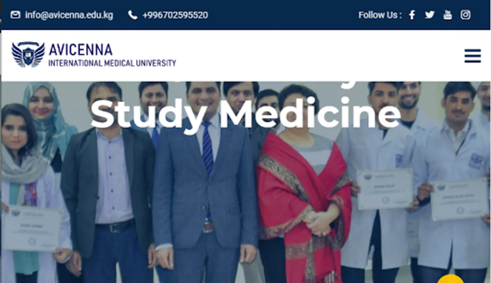 Avicenna International medical University is registered with the Ministry of Justice, Ministry of education and ministry of health of Kyrgyz Republic at the address Bishkek city (capital) kolbaeova 38 bearing License in higher professional education.The higher institution is meant for training qualified specialists in medical sphere both for Kyrgyz Republic and other countries of the world including Pakistan, Bangladesh, India, Nepal, Nigeria, America, Turkey, and Egypt… More than 1000 students are studying from these countries.