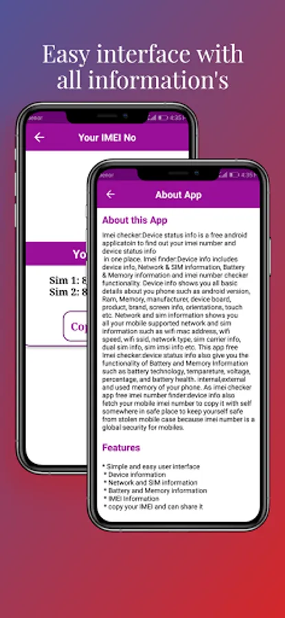 This free IMEI Number Checker 2023:Imei tracker 2023 helps you to check IMEI number, Device info, and battery info. you can copy device info and IMEI to the clipboard or share it to your email address for future reference in case your mobile gets lost or stolen.