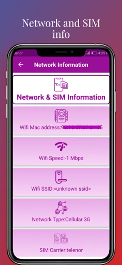 => Such as wifi mac address, wifi speed, wifi SSID, dual sim info, network type, carrier info i.e IMSI, IMEI, MCC and MNC, etc.