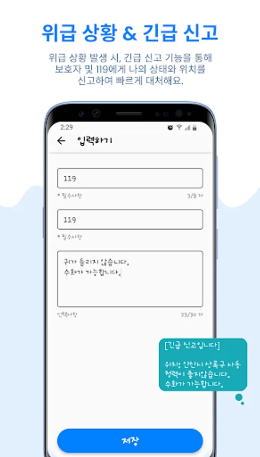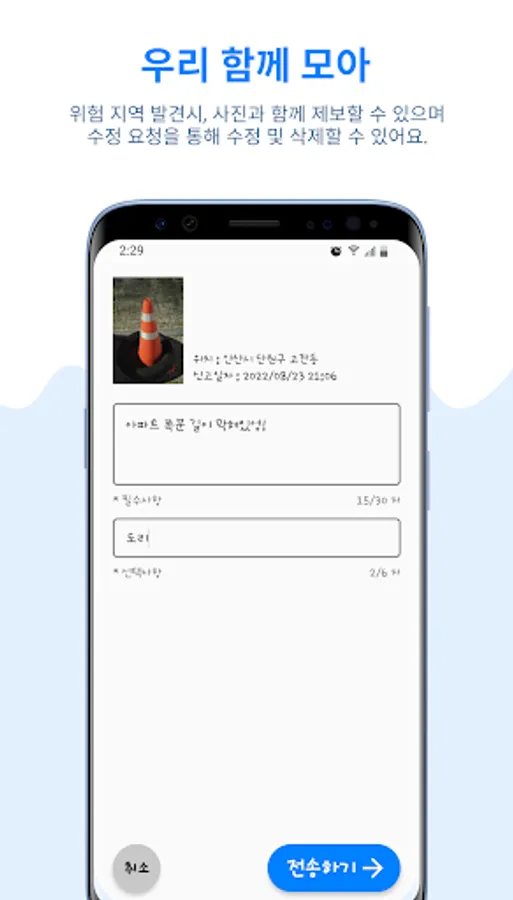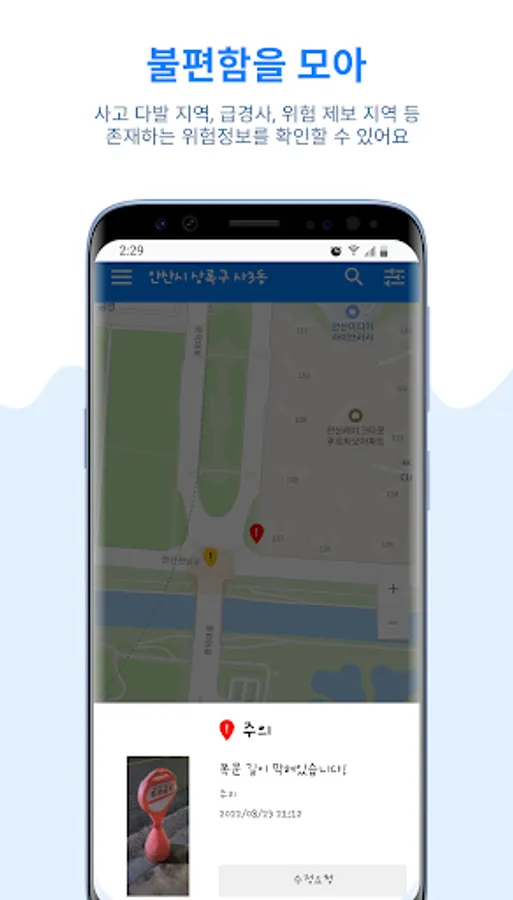 - To prevent misinformation, risk reporting photos can be registered only through real-time camera shooting. The location of the place where the photo was taken together and the reporting date are also saved.