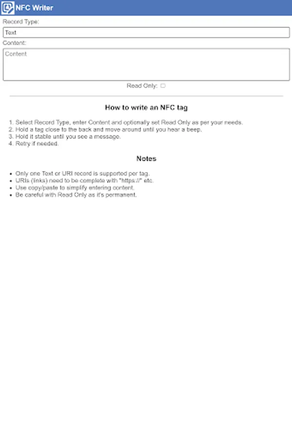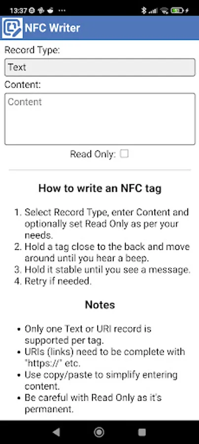 - Only one Text or URI record is supported per tag.