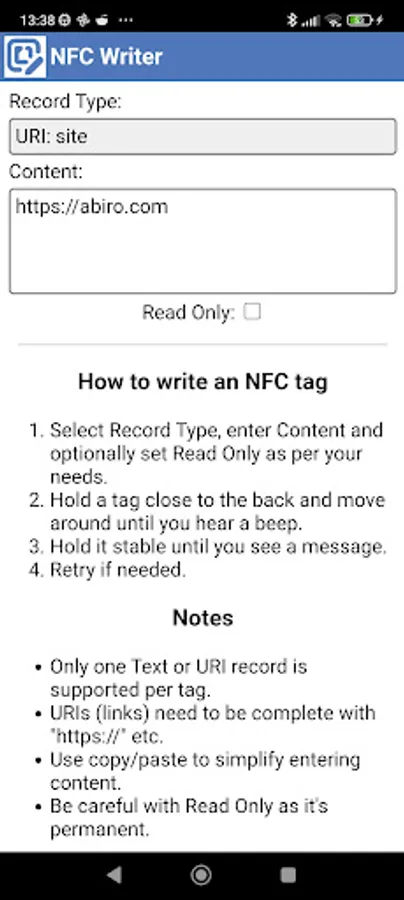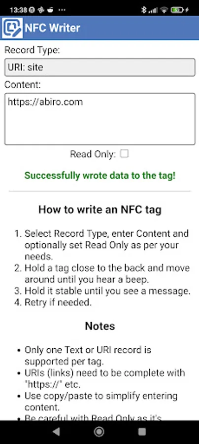 Use this very simple tool to write NFC tags, e.g. for opening sites.
