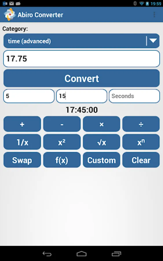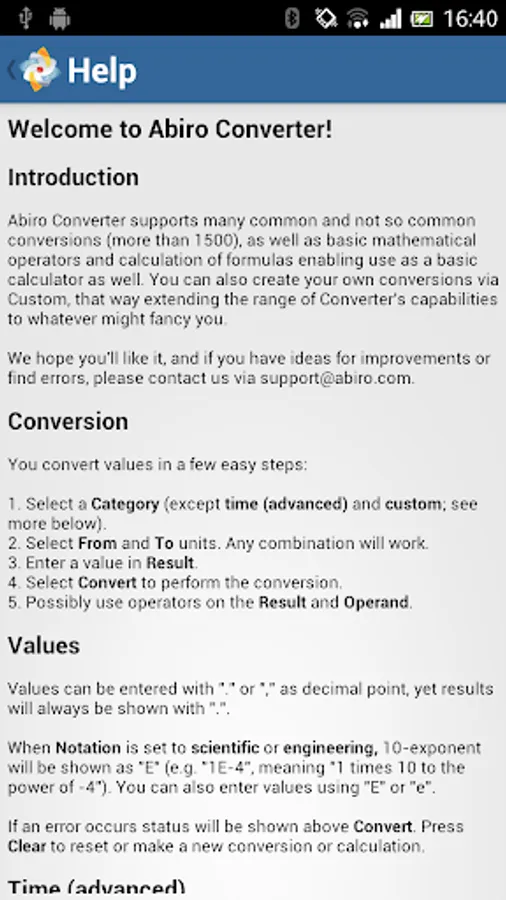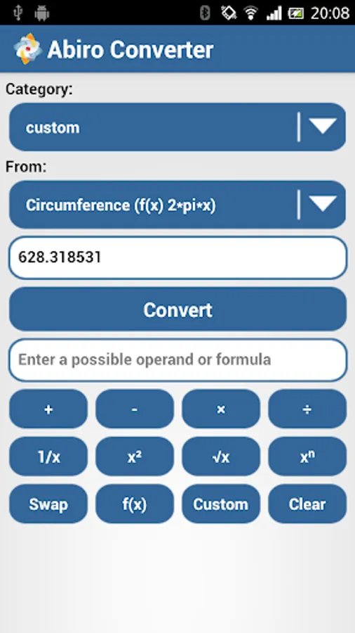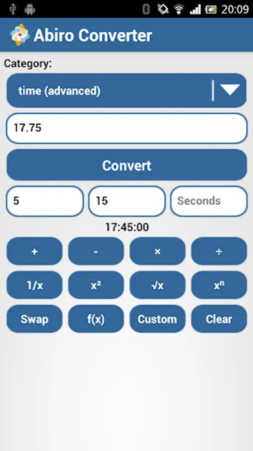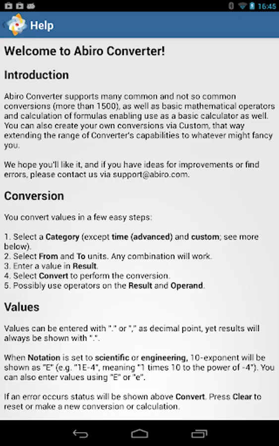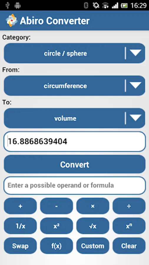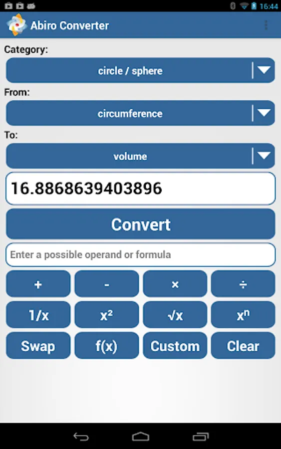 Abiro Converter supports many common and not so common conversions (more than 1700), as well as basic mathematical operators and calculation of formulas enabling use as a basic calculator as well. You can also create your own conversions via Custom, that way extending the range of Converter's capabilities to whatever might fancy you.