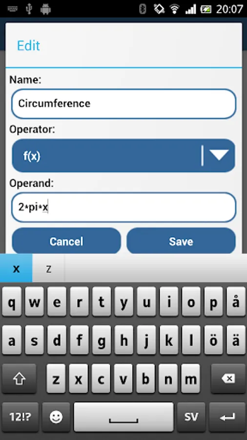 The input value (Result) is expressed as 'x' in the formula, e.g. 'sin(x)+x/2'. The result is shown again in Result to simplify accumulative calculations and conversions.