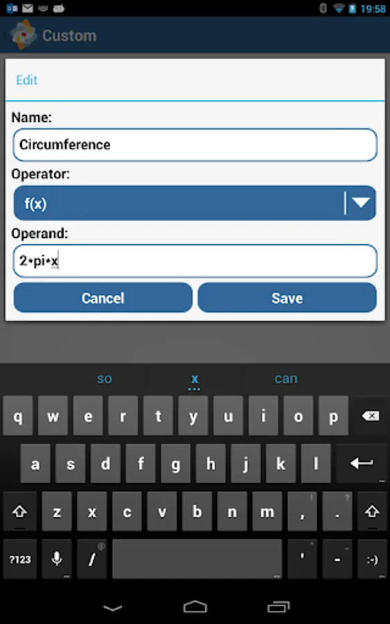 This applies to f(x) on the main screen and in Custom. In both cases the formula is entered in respective Operand field.