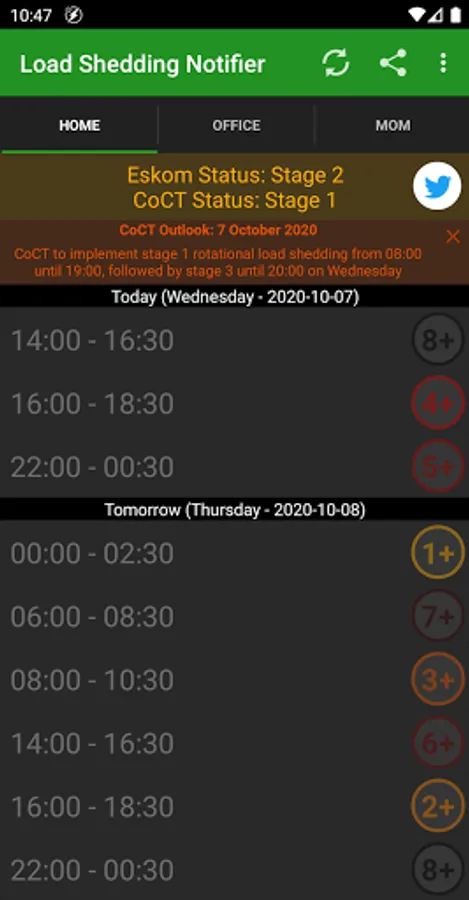 This app monitors the current Eskom load shedding status and notifies you if the power is scheduled to go off in your area.
