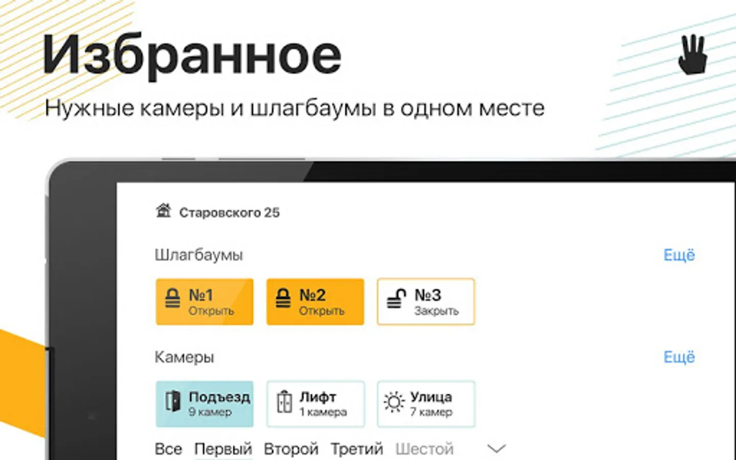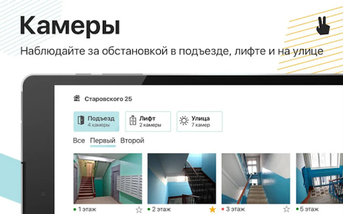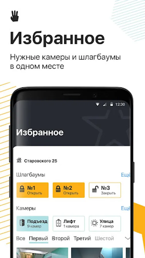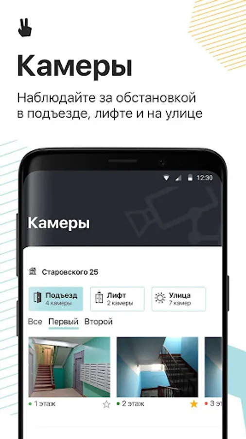 Cloud video surveillance - street, driveway and elevator cameras of your home can be viewed in one application. You can select the "favorite" cameras and watch only them. There is also access to the 7-day archive!