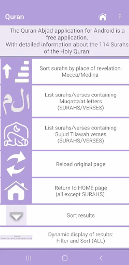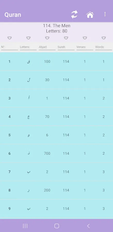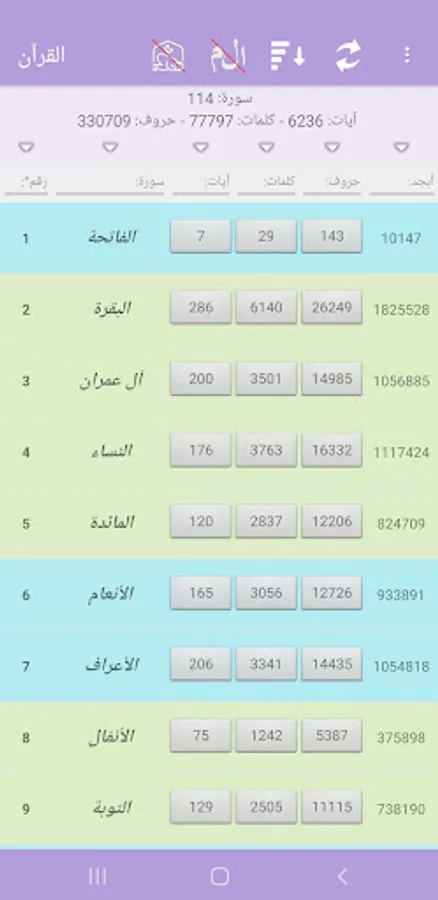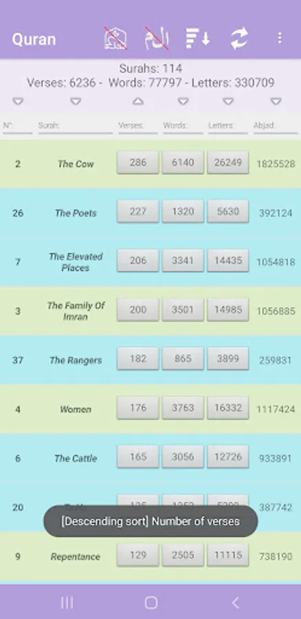 Search or sort Surah(s) by: number, name, number of Verses/Words/Letters, Abjad value