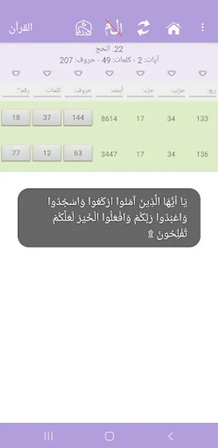 Search or sort Verse(s) by: its number, number of Words/Letters, Abjad value, Juz/Hizb/Rubu number