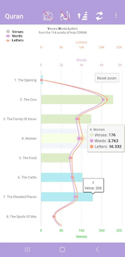 Show graphs of all Surahs with inforamtions about number of Verses/Words/Letters/Sujud Tilawah