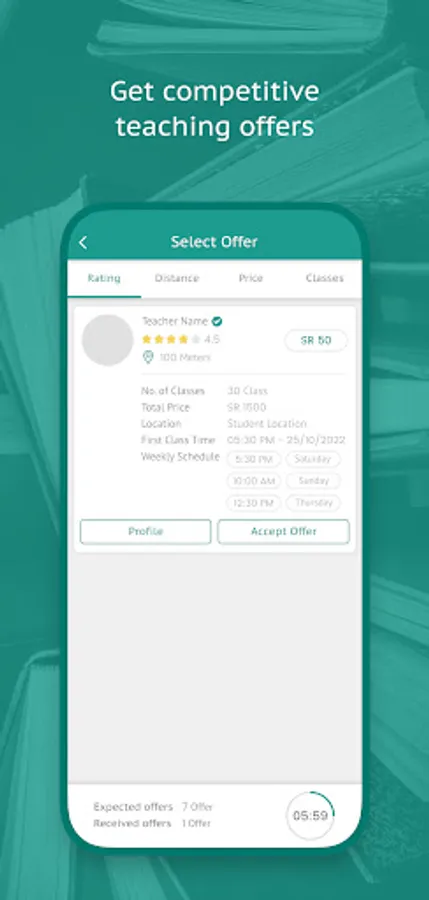 Interactive educational platform for private classes, connects students and teachers where students can send his request then receive competitive offers from teachers, which allow the student to compare and choose the most suitable offer and teacher, in addition the platform offers continuance discounts to offer support to students and the educational journey.