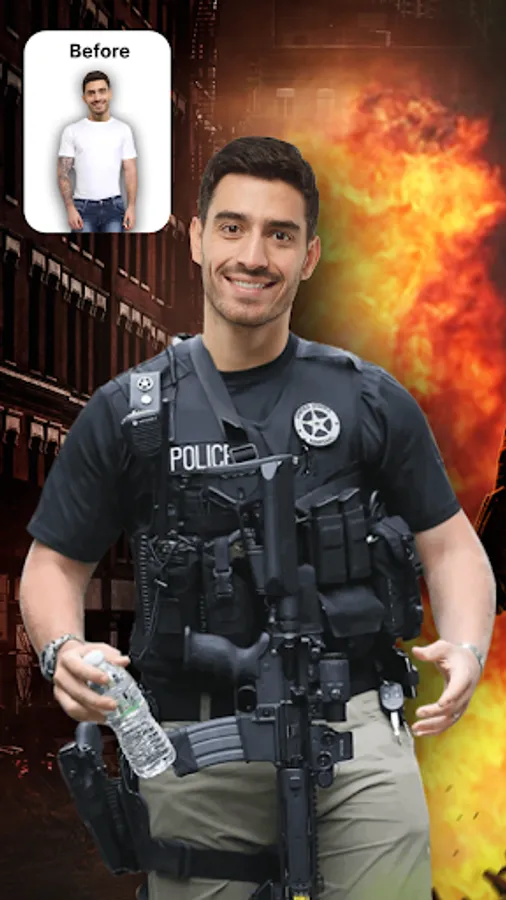 We present you Police Suit Photo Editor and Changer App that is an all in one photo editor that offers a variety of most Famous Police suits along with Caps, Mustaches and other important police accessories. With this Police Suit Photo Editor app, you can apply different filters to your photos, provided presets of Police suits that can be used over your pictures, you can also crop your picture that is suitable for your needs and you can also change your picture's background easily or you can use background remover option.
