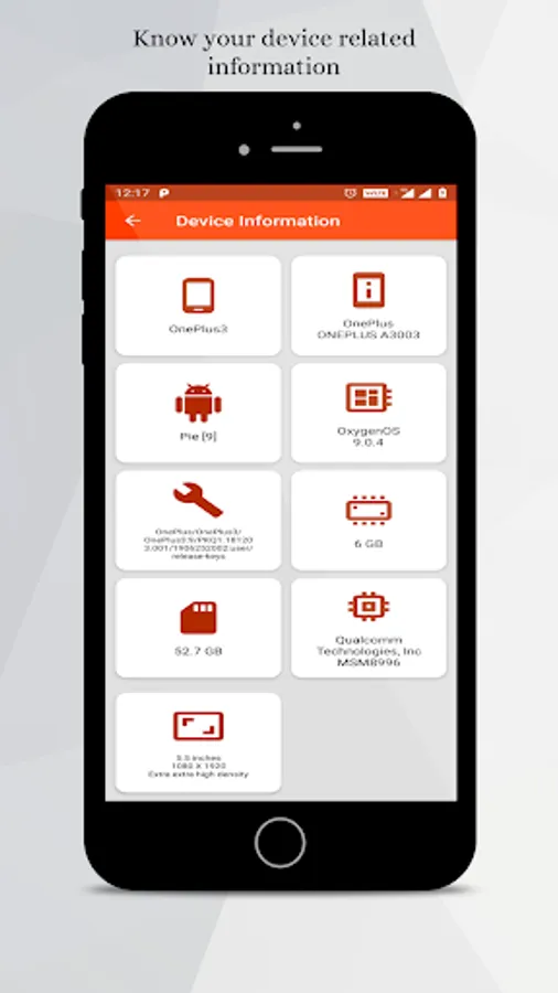 Custom OS name, Build version, Fingerprint, RAM, Storage, CPU Info and screen size