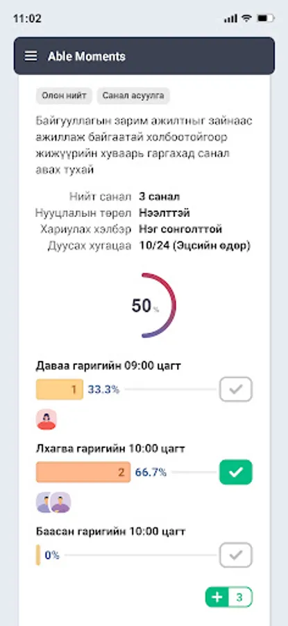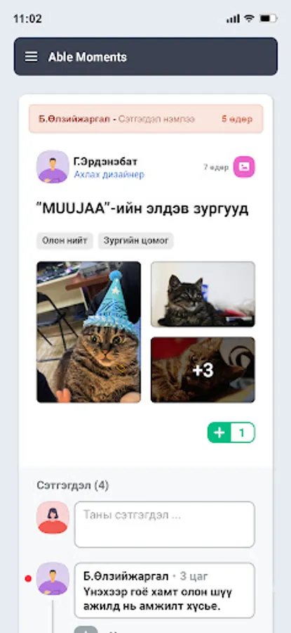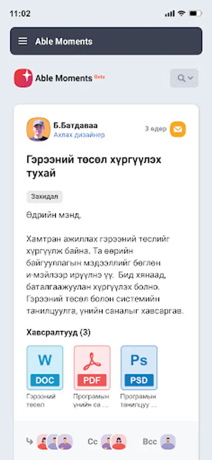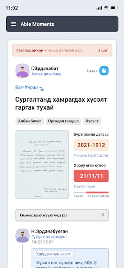 "Able moments" аппликейшн нь Able системийн өнцөг булан бүрээс төвлөрсөн ирсэн бичиг, өргөдөл гомдол, олон нийт, захидал, цаг бүртгэлийн хүсэлт програмуудад хийгддэг гол үйлдлүүдийг шууд гар утаснаасаа хийх боломжийг олгоно.